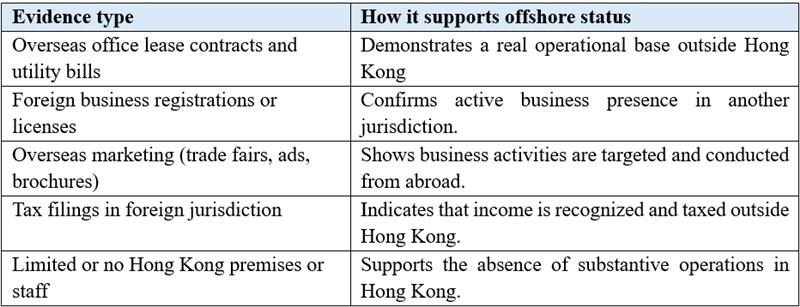 Providing evidence of genuine offshore operations—and minimal substantive activity in Hong Kong—strengthens an offshore claim.